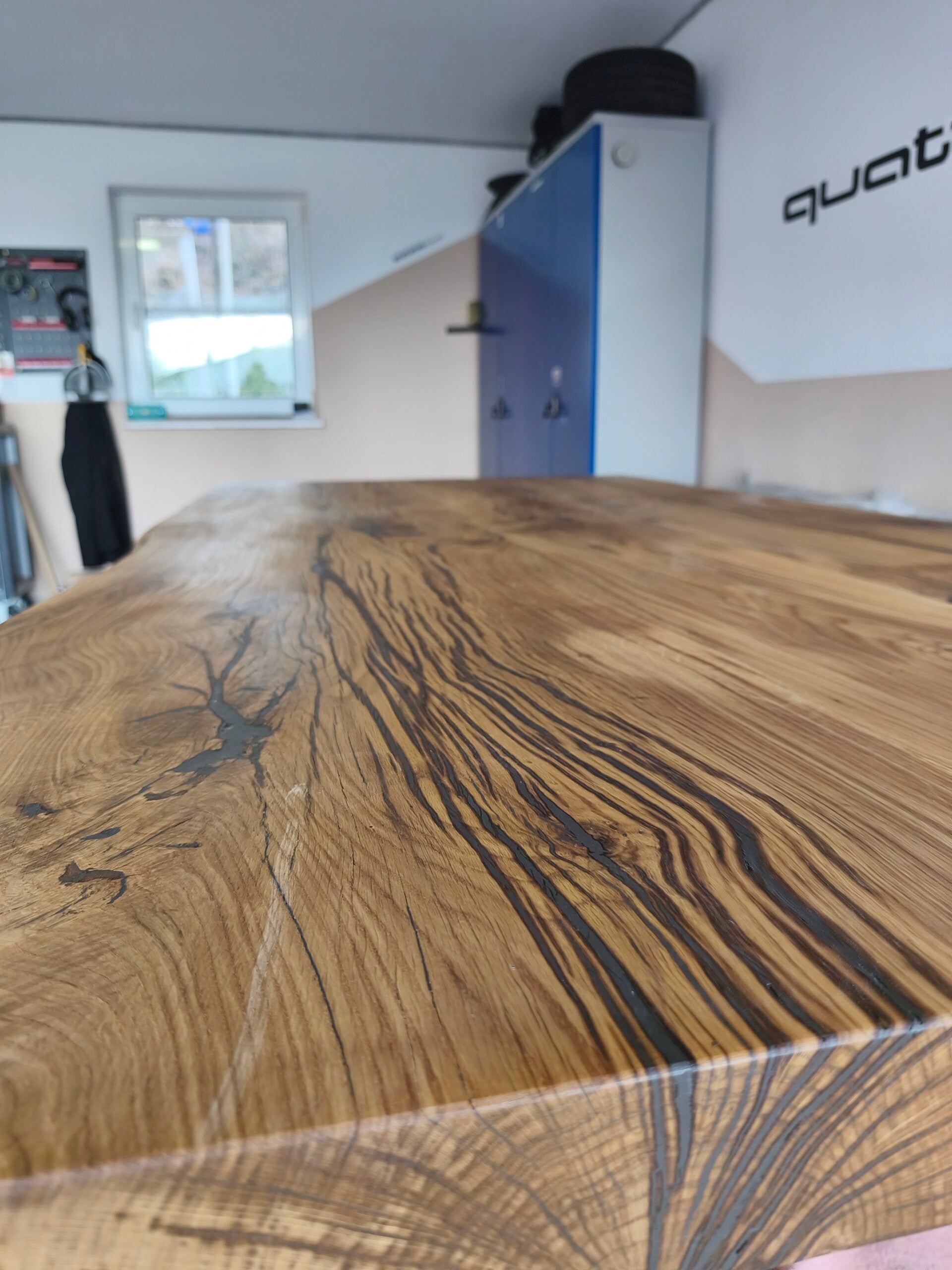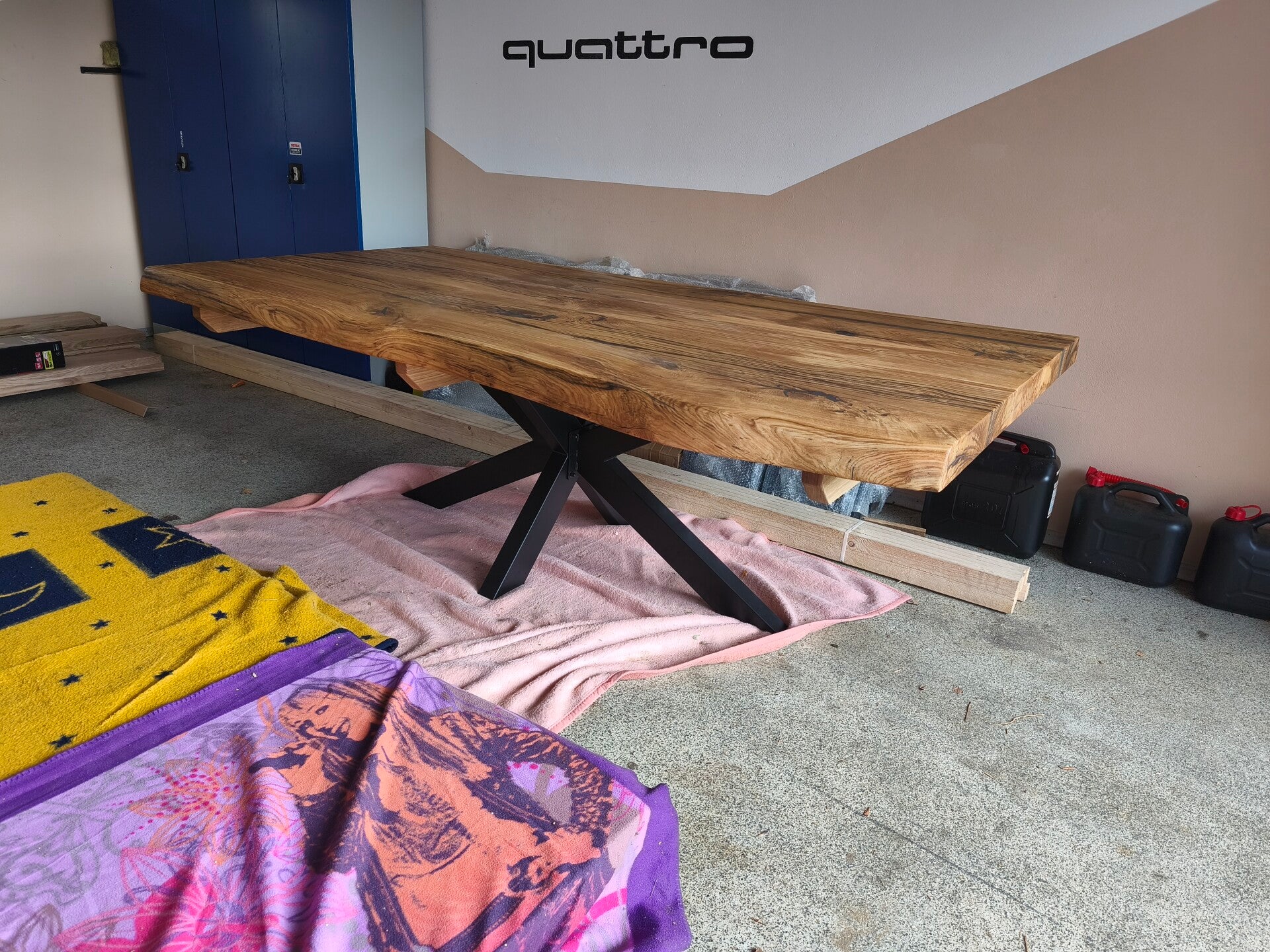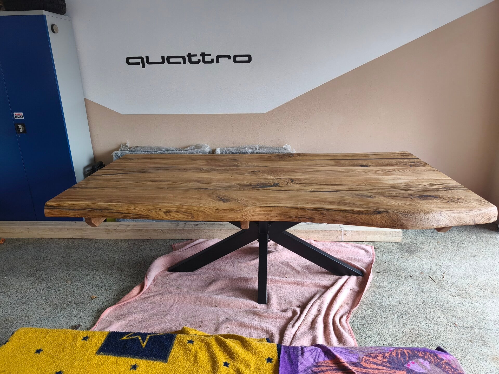 Wir bieten ihnen einen in einer Manufaktur gefertigten Eichentisch in den Dimensionen 240cm x 120cm und einer einzigartigen Plattenstärke von 75mm an. Der Tisch hat eine ruhige Baumkante und ist geölt. Im Preis inbegriffen ist ein Metalluntergestell in schwarz mit modernem Spyder Design.