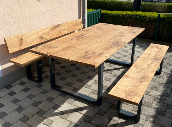 Unsere Sets Beinhalten einen Tisch welcher aus 3 Eichenbohlen, Metallunterzügen für Stabilität und einem hochwertigem Metalluntergestell besteht.